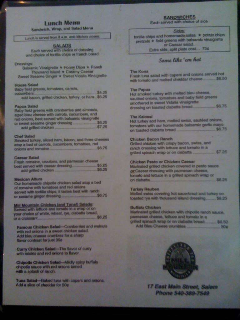 Mill Mountain Coffee Tea Menu In Salem Virginia Usa